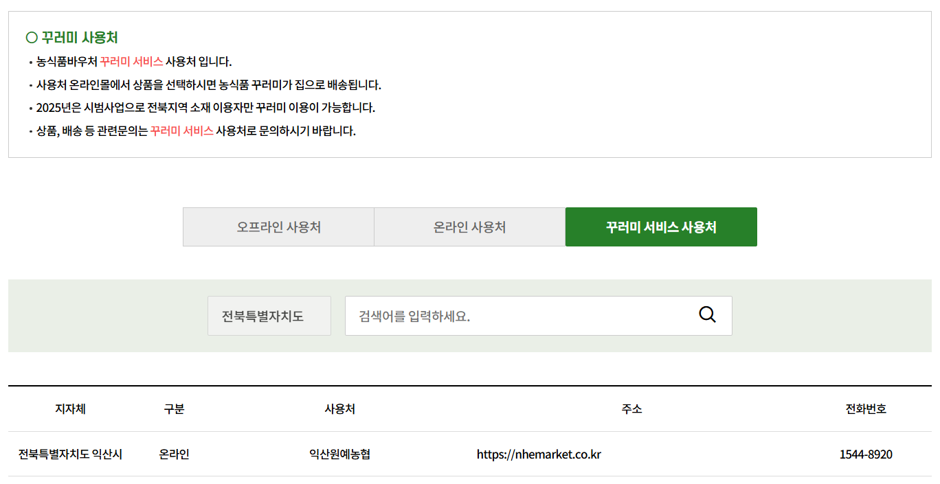 농식품 바우처에는 꾸러미 서비스라는 특별한 사용 방식도 있습니다. 꾸러미 사용처 온라인몰에서 상품을 선택하면, 농식품 꾸러미가 집으로 배송되는 방식입니다. 장보기가 어려운 가정이나 정기적인 식재료 수령을 원하는 분들에게 적합한 서비스입니다. 다만 2025년은 시범사업 기간으로, 전북 지역 이용자만 꾸러미 이용이 가능합니다. 상품 구성이나 배송 일정, 품질 관련 문의는 각 꾸러미 서비스 사용처로 직접 문의해야 하며, 자세한 내용은 농식품 바우처 공식 홈페이지에서 확인할 수 있습니다.